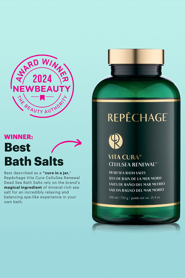 "Containing essential minerals like magnesium, calcium, sulfur, bromide, iodine, sodium, zinc, and potassium, Repêchage’s Vita Cura Cellusea Renewal Dead Sea Bath Salts are ideal for pulling toxins from the body and replacing vital minerals and nutrients."
