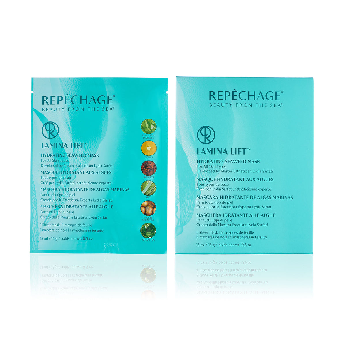 The Repêchage® Lamina Lift™ Mask is instantly refreshing and hydrating, leaving your skin dewy and glowing. Formulated with the exclusive Repêchage® Laminaria Digitata complex, combining seaweed, Orange Water, and Aloe, this convenient sheet mask also contains natural ingredients like Rooibos Tea, Licorice Root and Horse Chestnut extracts to help tone and brighten the appearance of the skin.
